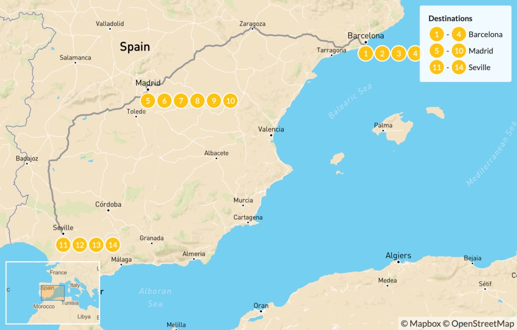 Map of Spain Luxury Tour: Barcelona, Madrid, & Seville – 15 Days