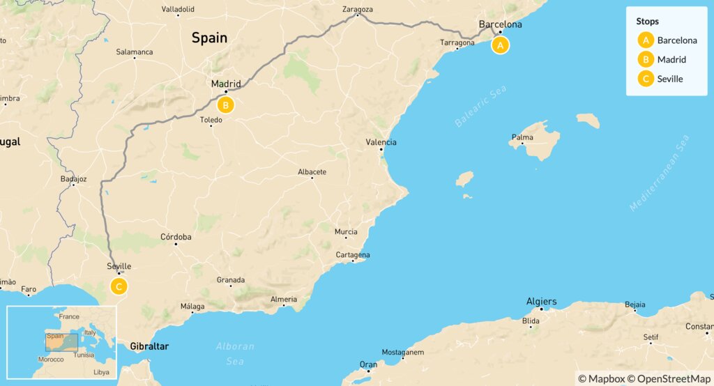 Map of Spain Luxury Tour: Barcelona, Madrid & Seville – 7 Days