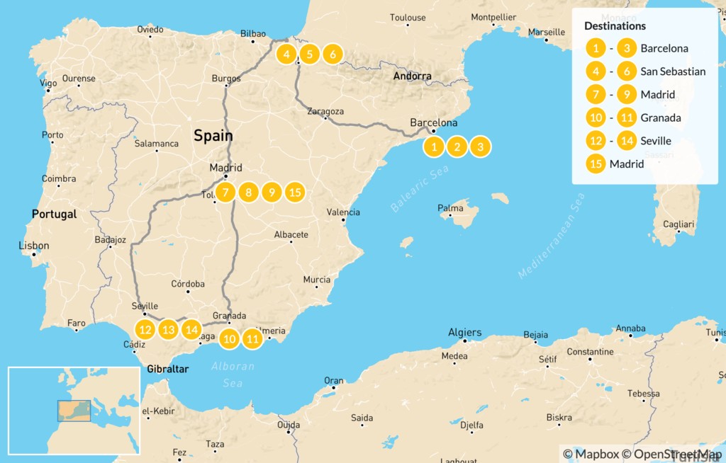 A little over two weeks is all you need to visit the highlights of Spain. This 16-day itinerary is a whirlwind of royal palaces and Moorish temples, world-class gastronomy and some of the most beautiful natural landscapes anywhere in the world. The destinations you’ll visit cover the map, from Barcelona and Basque Country to Madrid and the stunning cities of Andalusia, like Seville and Granada.