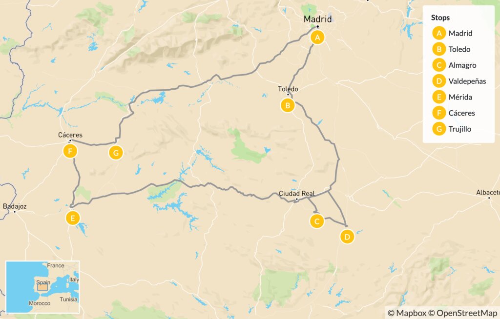 Map of Spain Off-the-Beaten-Path Road Trip: Madrid, La Mancha & Extremadura – 13 days