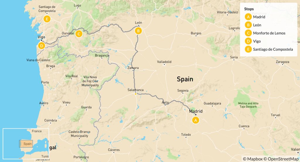 Map of Spain Road Trip: Madrid, León & Santiago de Compostela – 8 Days