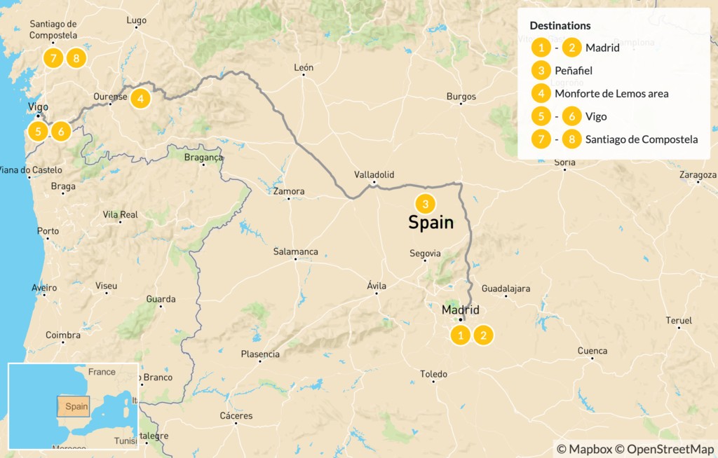 Map of Spain Road Trip: Madrid & Santiago de Compostela – 9 Days