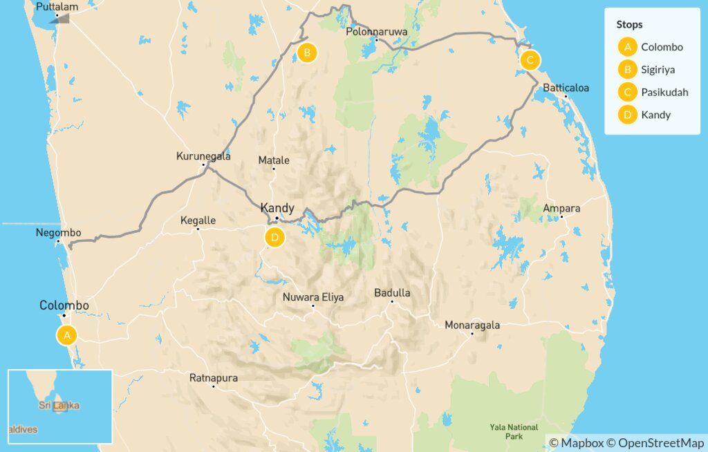 Map of Sri Lanka Family Getaway: Sigiriya, Pasikudah & Kandy – 7 Days