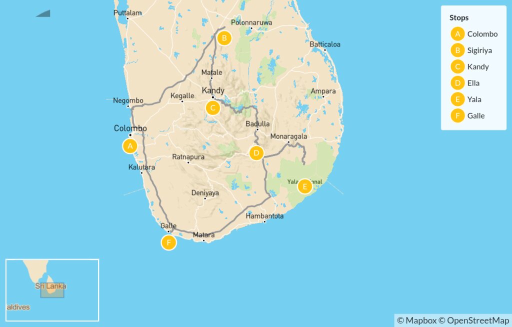 Map of Sri Lanka Highlights: Sigiriya, Kandy, Ella, Yala & Galle – 9 Days
