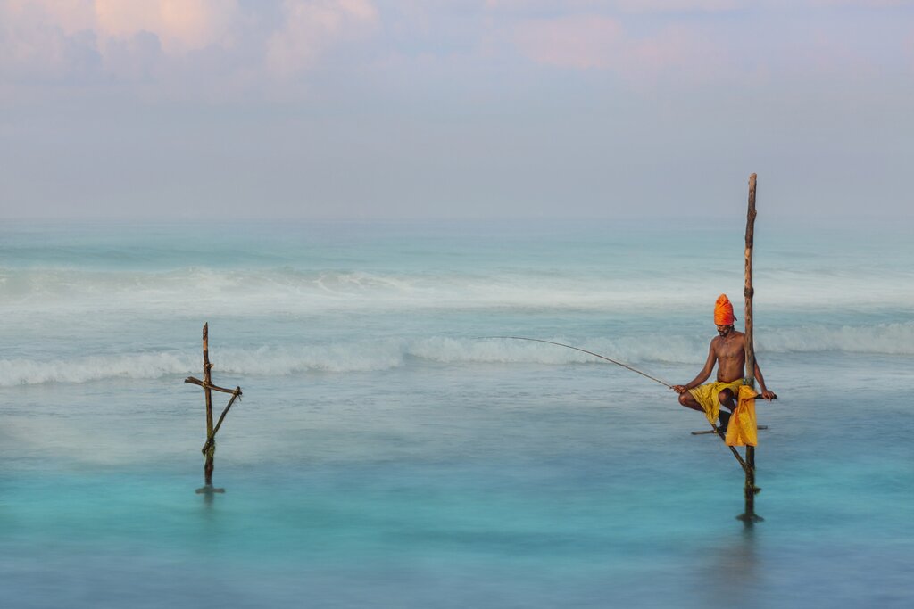 Driving along the coast into town, you’ll see something interesting: men perched on sticks rising out of the ocean. These are the region’s famous stilt fishermen, and their method is unique to Sri Lanka. They sit on a cross bar called a petta, tied to a vertical pole and driven into the sand a few meters offshore. From this high vantage point, the fishermen cast their lines and wait for a bite. It’s a simple yet effective method the residents of southern Sri Lanka have practiced since antiquity. You’ll stop to see them ply their trade, then continue to your hotel in Weligama.