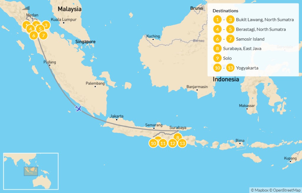 Map of Sumatra & Java : Orangutans, Volcanoes & Indonesian Culture – 14 Days
