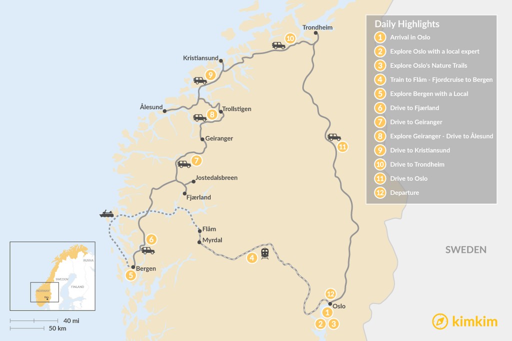 Map of Summer Road Trip: Oslo, Bergen & Trondheim – 12 Days