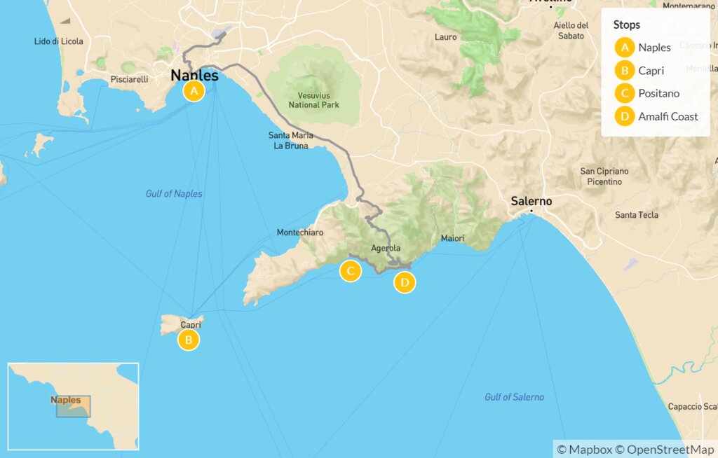 Map of Sun-Soaked Escape to Naples, Capri & the Amalfi Coast – 8 Days