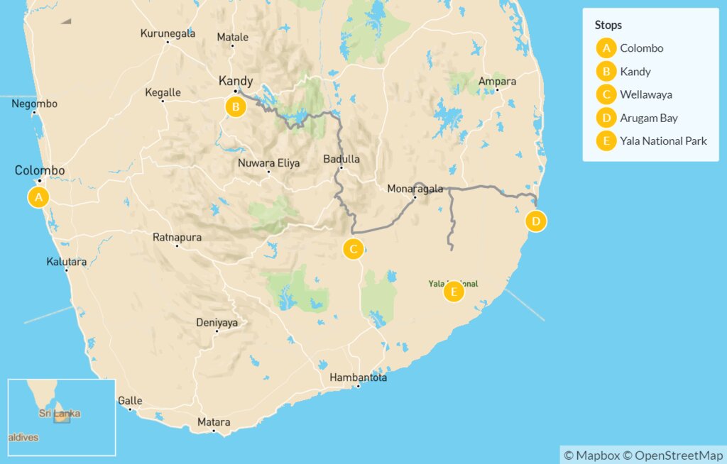 Map of Surfing, Safaris & Scenery in Southern Sri Lanka – 9 Days