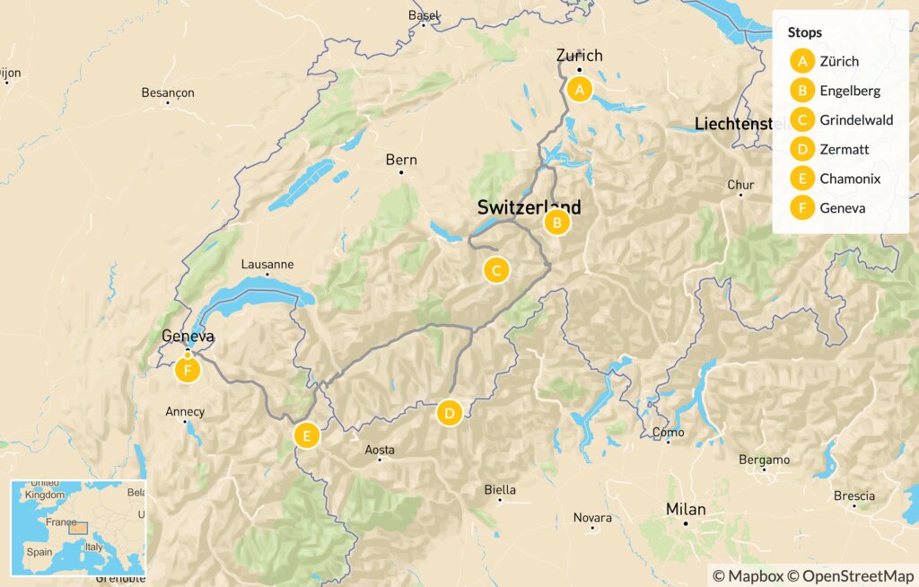 Map of Swiss Winter Adventure: Engelberg, Grindelwald, Zermatt & Chamonix – 5 Days