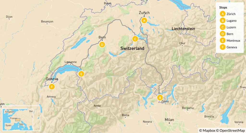 Map of Switzerland’s Scenic Highlights: Zürich, Lugano, Lucerne, Bern & Montreux – 10 Days