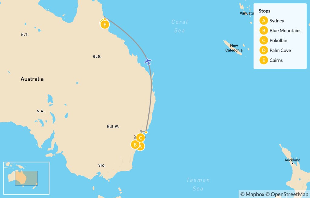 Map of Sydney, Blue Mountains, Hunter Valley & Great Barrier Reef – 9 Days