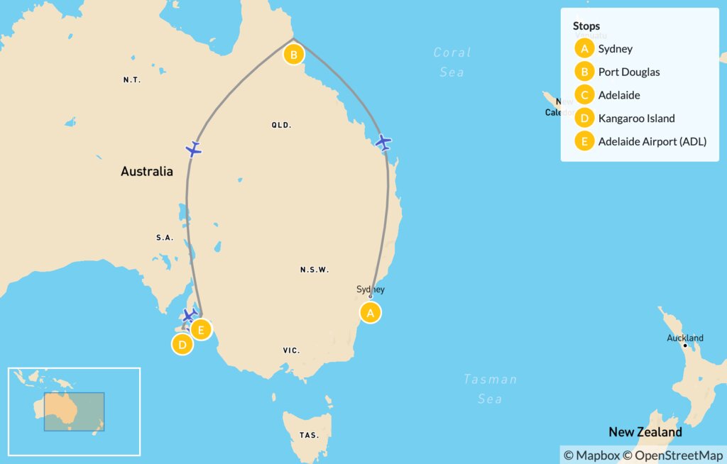 Map of Sydney, Great Barrier Reef, Adelaide & Kangaroo Island – 12 Days