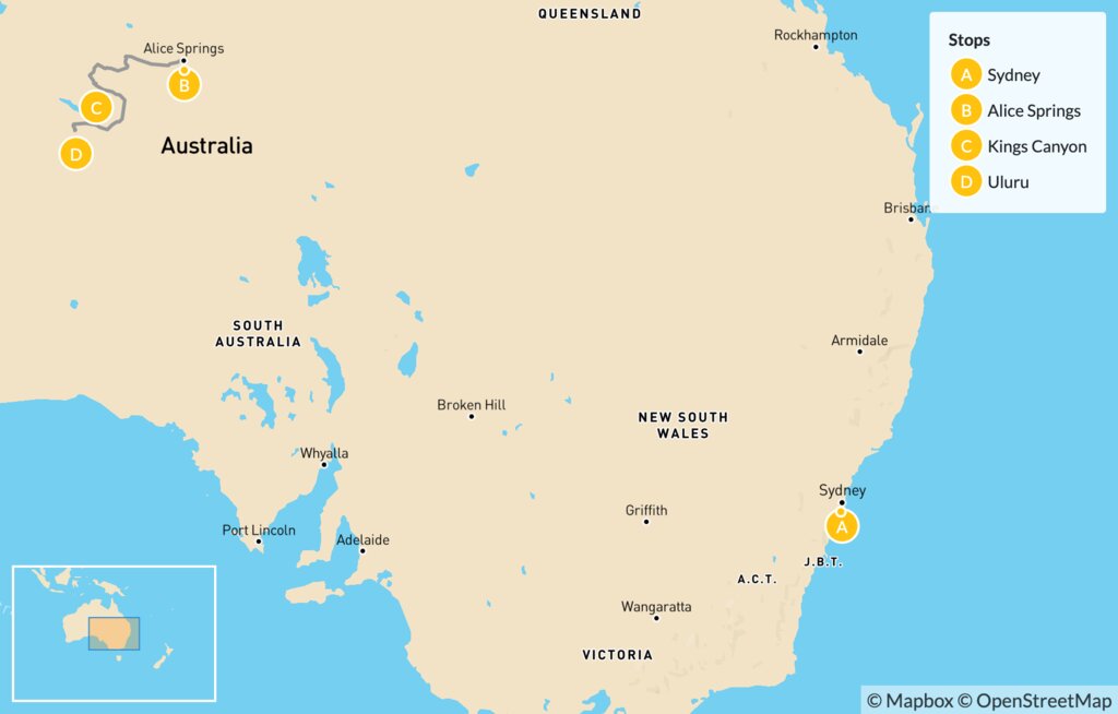 Map of Sydney & Outback Highlights: Alice Springs, Kings Canyon & Uluru – 9 Days