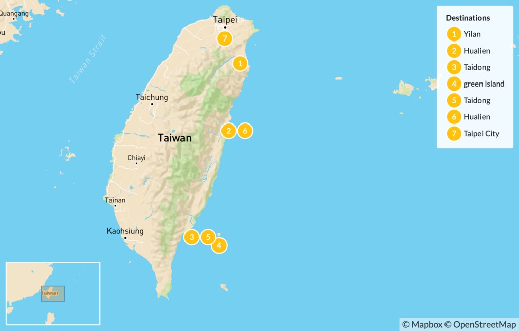 Map of Taiwanese East Coast & Green Island Tour – 7 Days