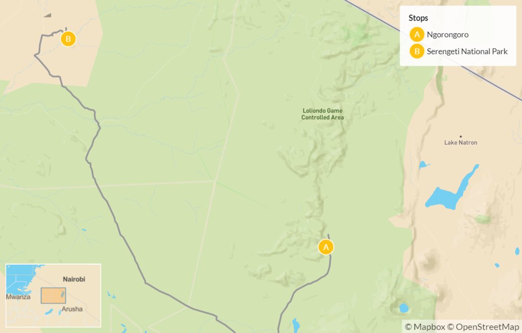 Map of Tanzania Safari Highlights: Ngorongoro & Serengeti – 5 Days