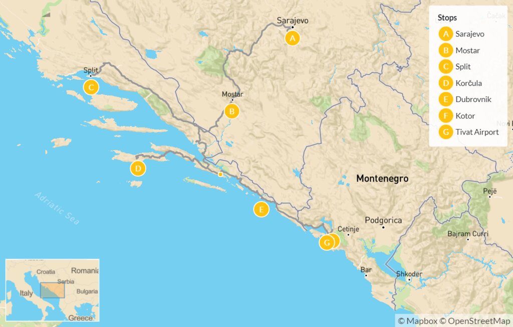 Map of Taste of the Balkans: Sarajevo, Mostar, Split, Dubrovnik & Kotor – 14 Days