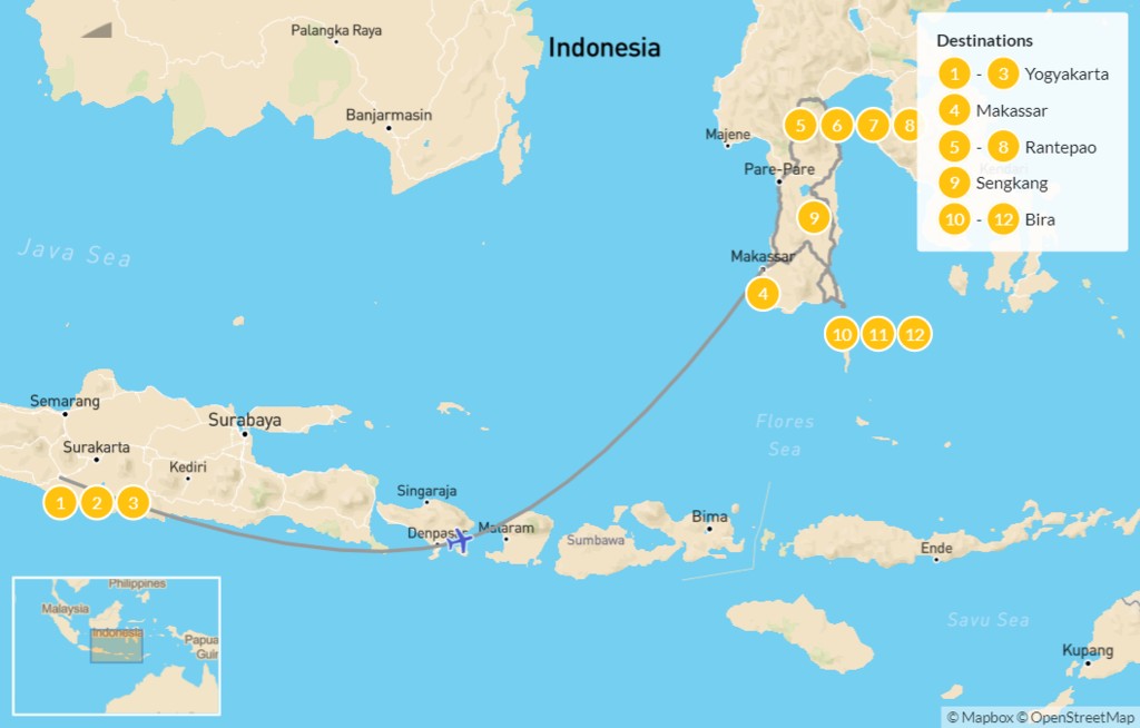 Map of Temples & Tradition in Java & Sulawesi – 13 Days