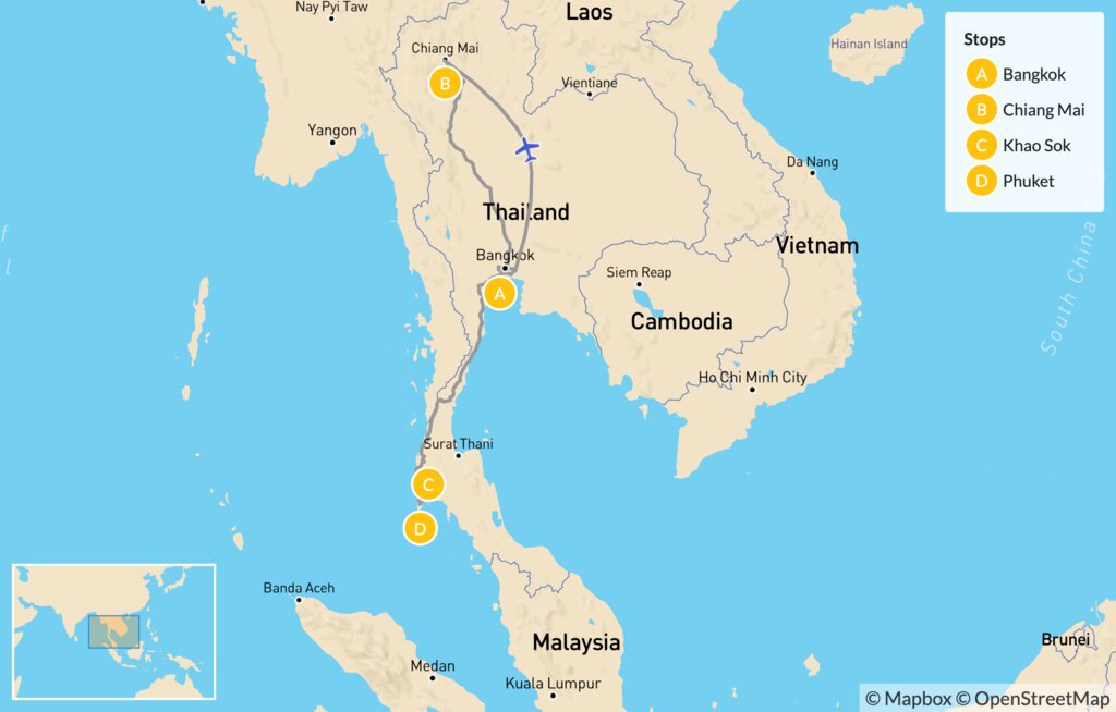 Map of Thai Culture & Nature for Families: Bangkok, Chiang Mai, Khao Sok & Phuket – 14 Days