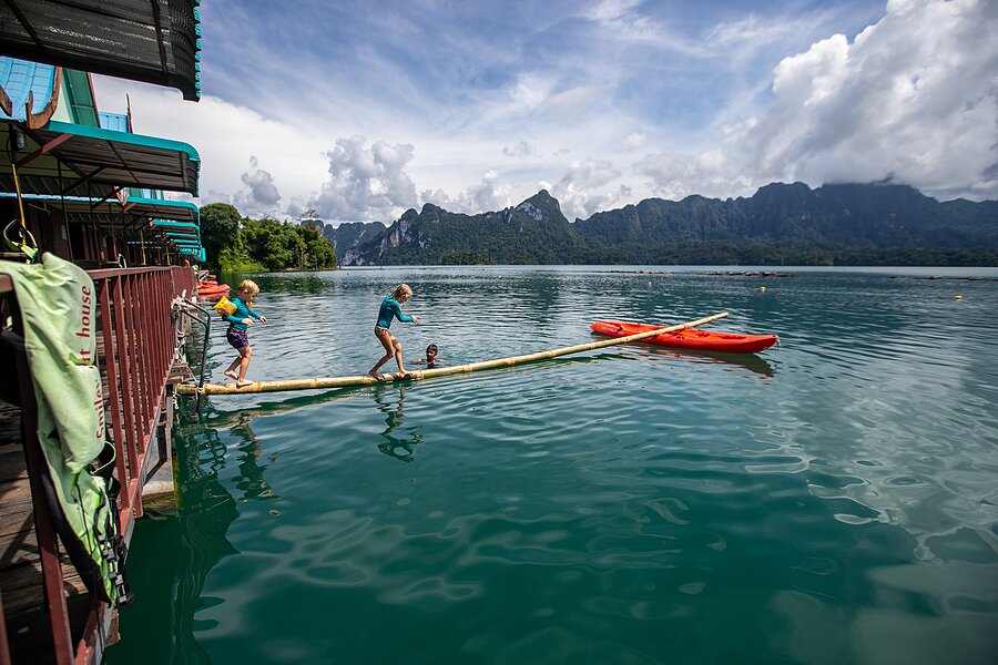 Next, you’ll hop in a private boat to reach your unusual accommodation for the next three days, 500 Rai Floating Resort. This unique floating resort is set on the tranquil waters of Heiwlan Dam in the heart of the national park. Surrounded by lush rainforest, it’s an ideal place for your family to disconnect from the outer world and reconnect with each other.