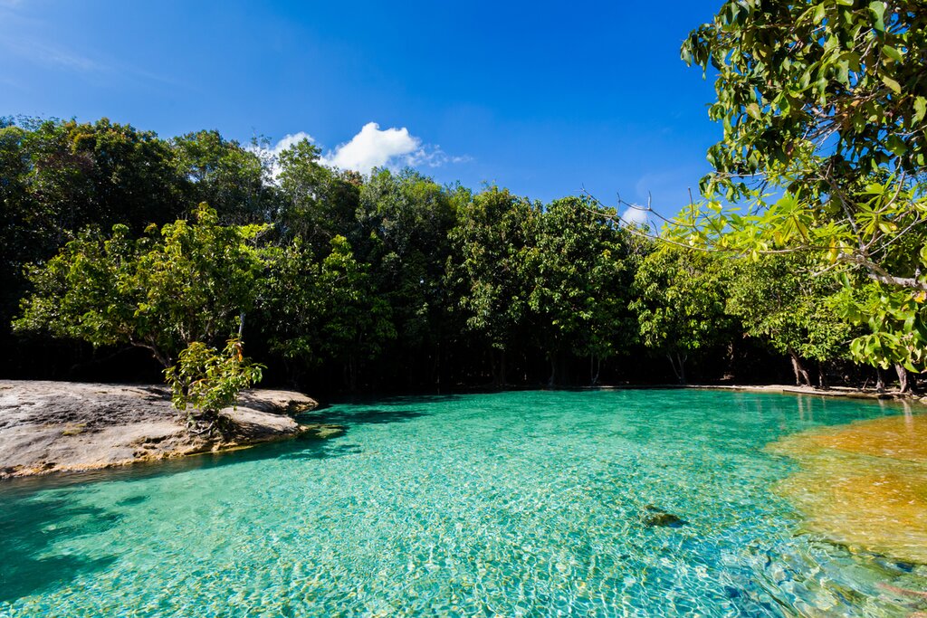 In the morning, you’ll head out on a tour to visit the highlights in and around Krabi. The adventure begins with a pickup from your hotel and a trip to the stunning emerald pool at the Khao Phra Bang Khram Wildlife Sanctuary. Walk along the rainforest trails at this nature reserve, then cool off with a refreshing dip in the water.