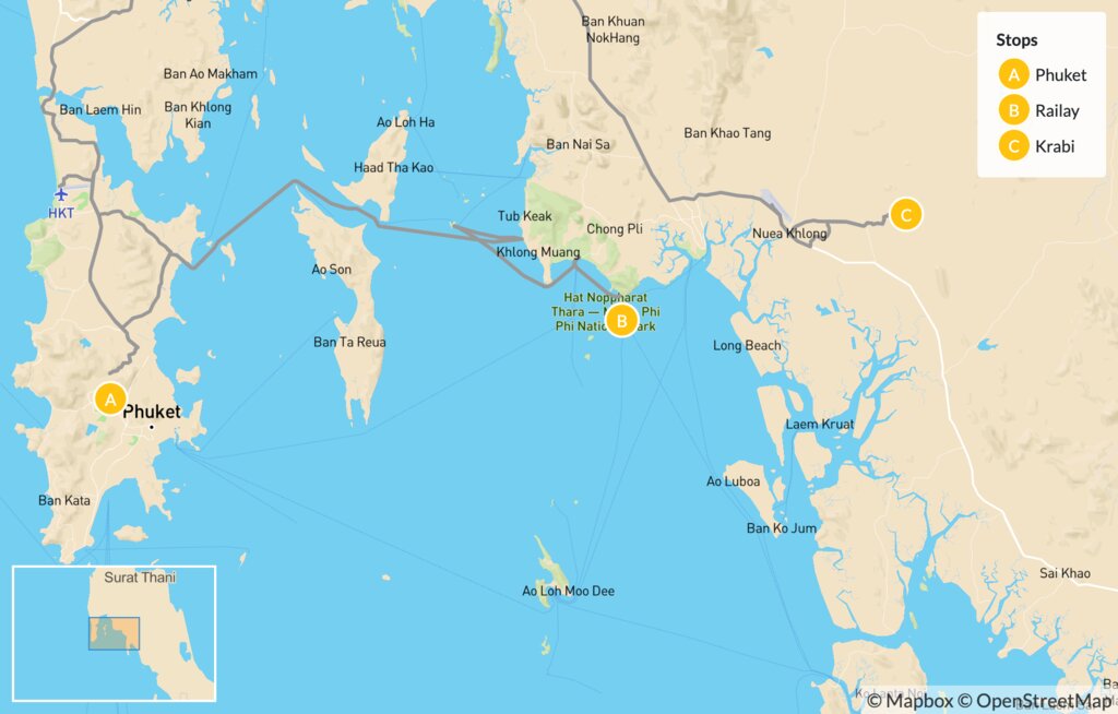 Your personal driver will pick you up this morning for the 3.5-hour drive north from Phuket and east around the coast to Railay. Located on the Andaman Coast in Krabi Province, Railay is primarily known for its dramatic karst cliffs and mountains, as well as for being a rock-climbing hot spot. Upon arrival at Railay Beach, you’ll check in to your hotel and can relax after the long drive.