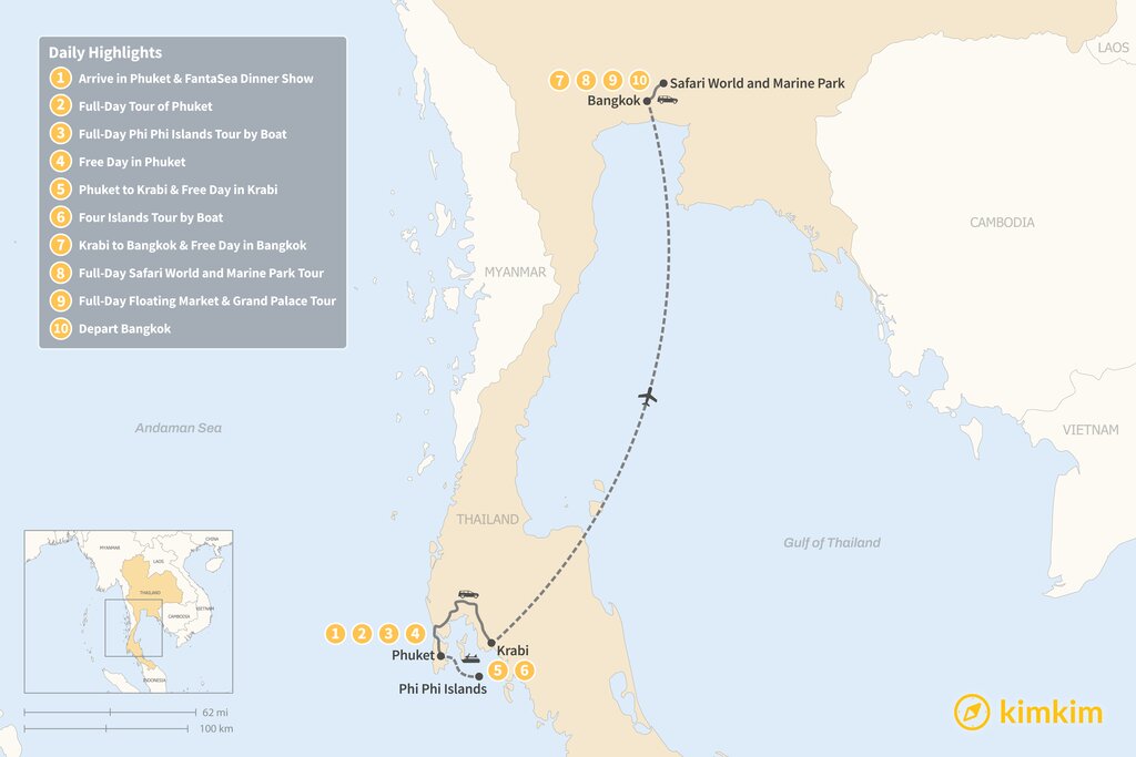 Map of Thailand Beaches & City Highlights: Phuket, Krabi & Bangkok – 10 Days