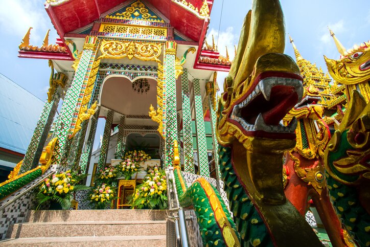The first stop on this boat tour will be the waterfront temple of Wat Khun Chan. You can’t miss the giant, colorful statues of Buddha, deities, and animals. Then, it’s on to Wat Paknam, a royal temple dating to the 17th century. You can step back in time at the temple’s museum, which showcases artifacts of Bangkok and Thailand’s history. This temple complex is also famous for its 226-foot (69 m) statue of a seated golden Buddha—the largest in the city. From here, you’ll travel back to the Chao Phraya River and return to the pier, where you’ll disembark and have lunch nearby.