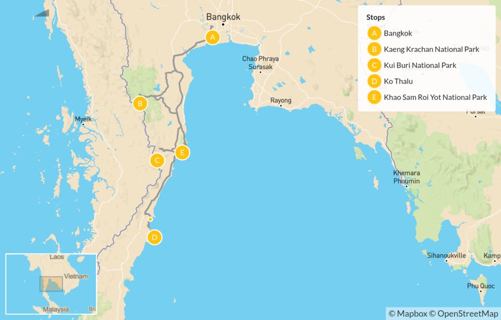 This seven-day wildlife-filled itinerary delves into some of Thailand’s most spectacular nature and national parks. After touching down in Bangkok, you’ll transfer to Kaeng Krachan to spot macaques, leopards, and mongooses. Then it’s on to Kui Buri, where you’ll see elephants roaming in the wild and take an atmospheric night safari. Ko Thalu is next, for unspoiled island relaxation, before traveling to the marine park of Khao Sam Roi Yot and its lush mangrove forests and caves.