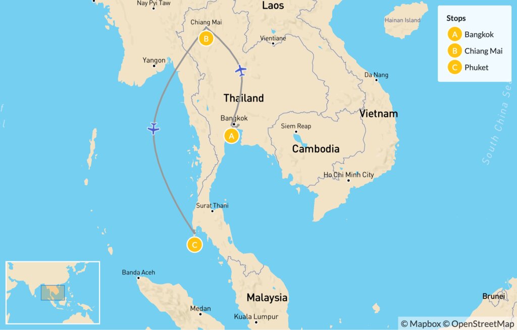 Map of Thailand North & South: Bangkok, Chiang Mai & Phuket – 12 Days