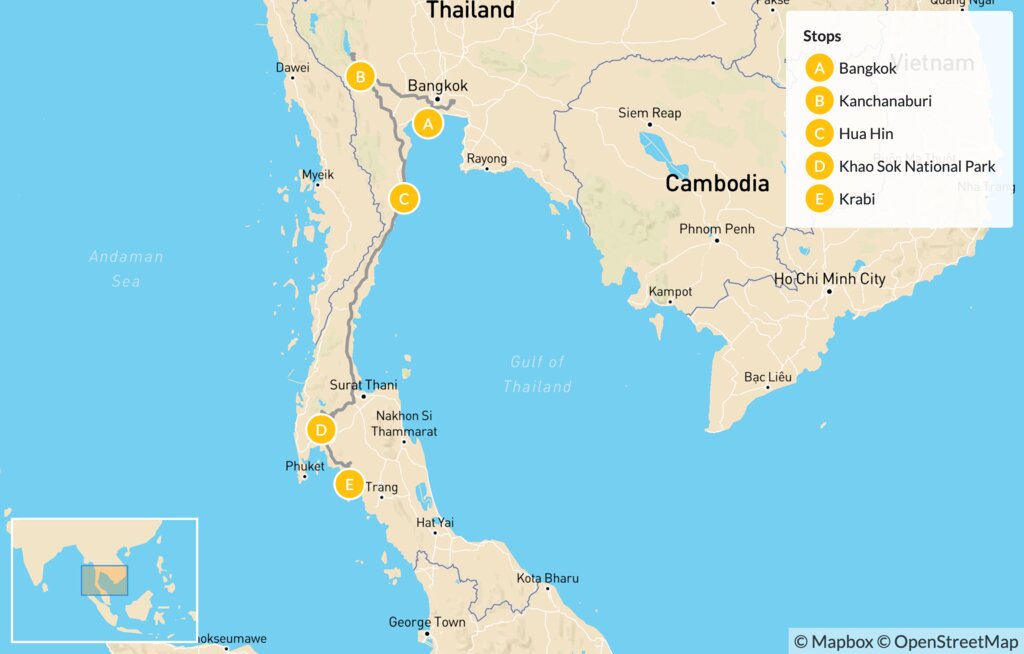 Map of Thailand’s Natural Treasures for Families: Bangkok, Hua Hin, Khao Sok & Krabi – 14 Days