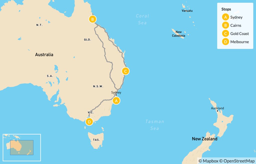Map of The Best of Eastern Australia: Sydney, Cairns, Gold Coast & Melbourne – 15 Days