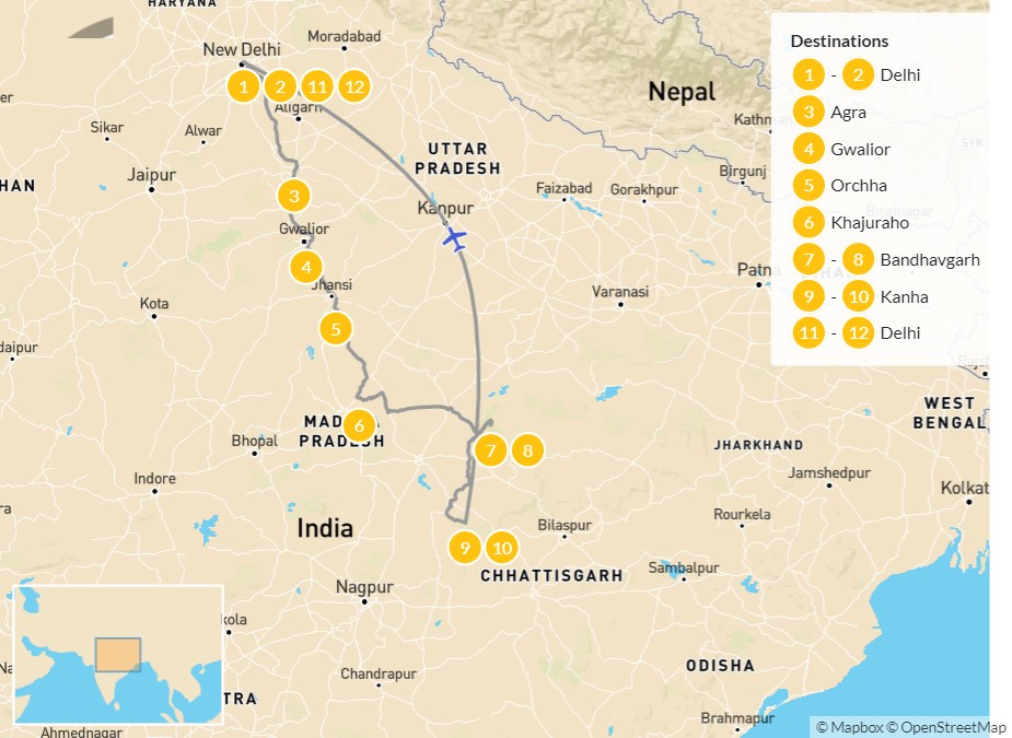 Map of Tiger Lands of Central India: Delhi, Agra, Bandhavgarh, & Kanha – 12 Days