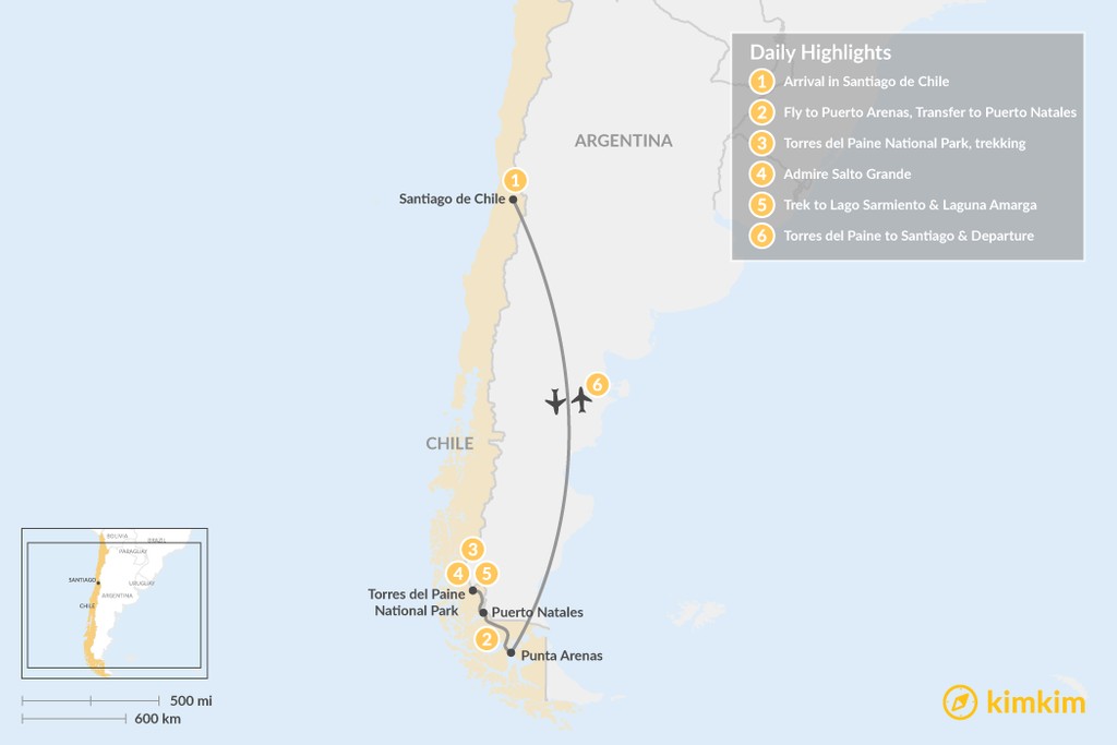Map of Torres del Paine Experience – 6 Days
