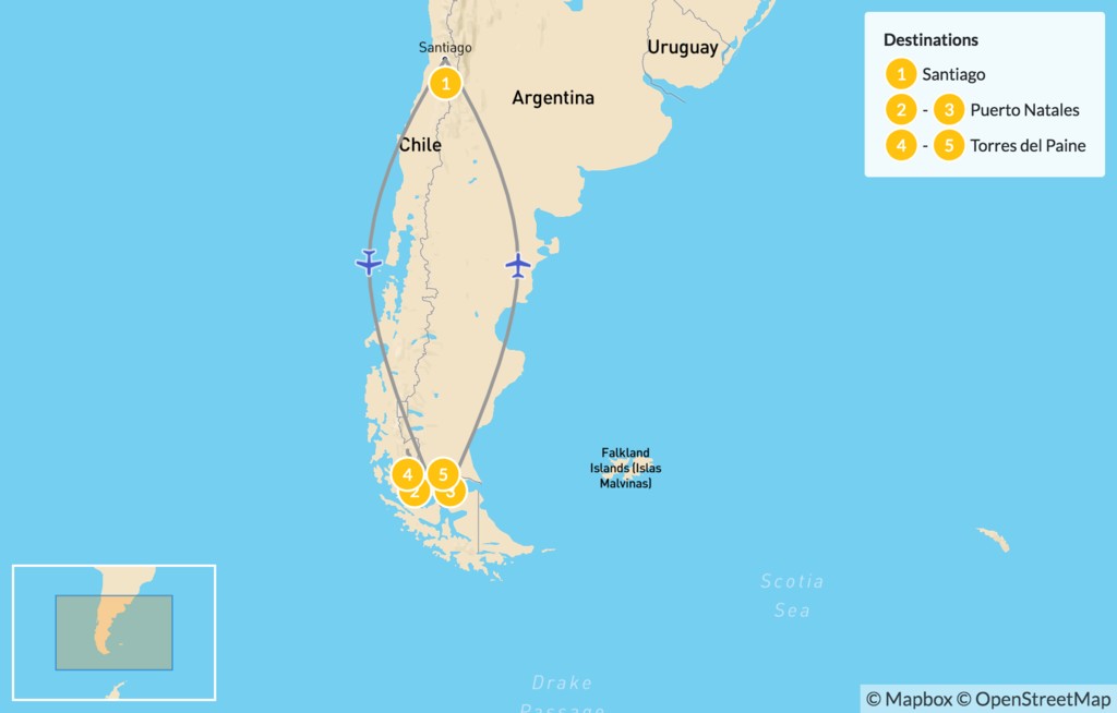 Today, you’ll take a private transfer from Torres del Paine National Park to the Punta Arenas airport. You’ll then hop on a domestic flight to Santiago. From there, you’ll meet your connecting flight home. ¡Buen viaje!