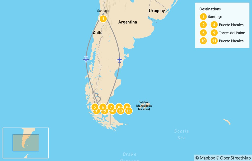 | Day 2 | Fly from Santiago to Punta Arenas – Transfer to Puerto Natales | Puerto Natales |