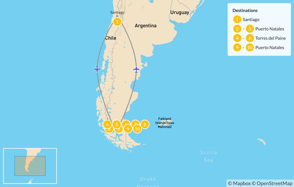Map of Torres del Paine & Ultima Esperanza Fjord – 11 Days