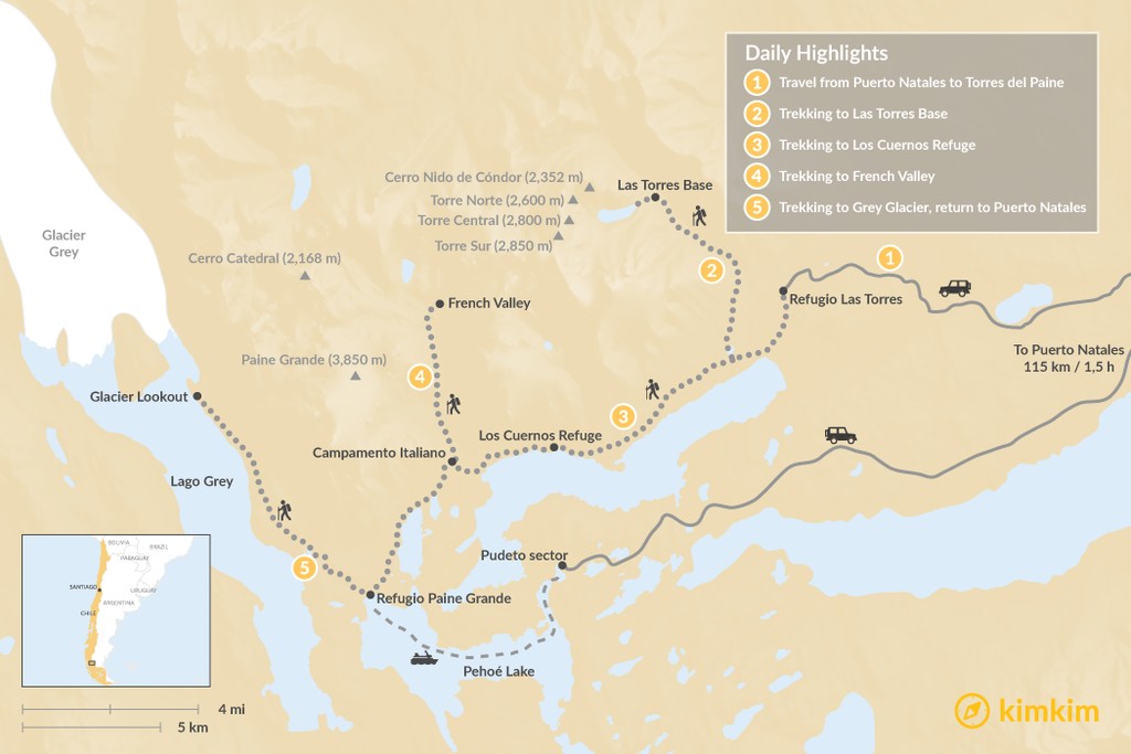| Day 5 | French Valley (Trek) | Paine Grande Shelter | 10-12 hours (15.7 mi/25.3 km) |