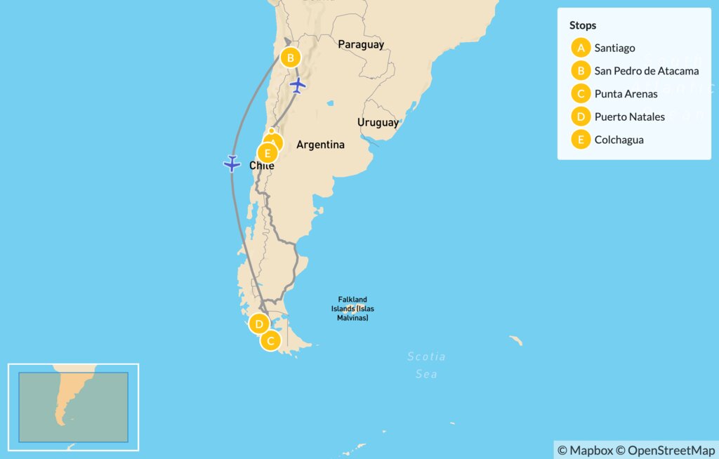 Map of Total Chile Tour: Santiago, Atacama, Patagonia & Wine Country – 16 Days
