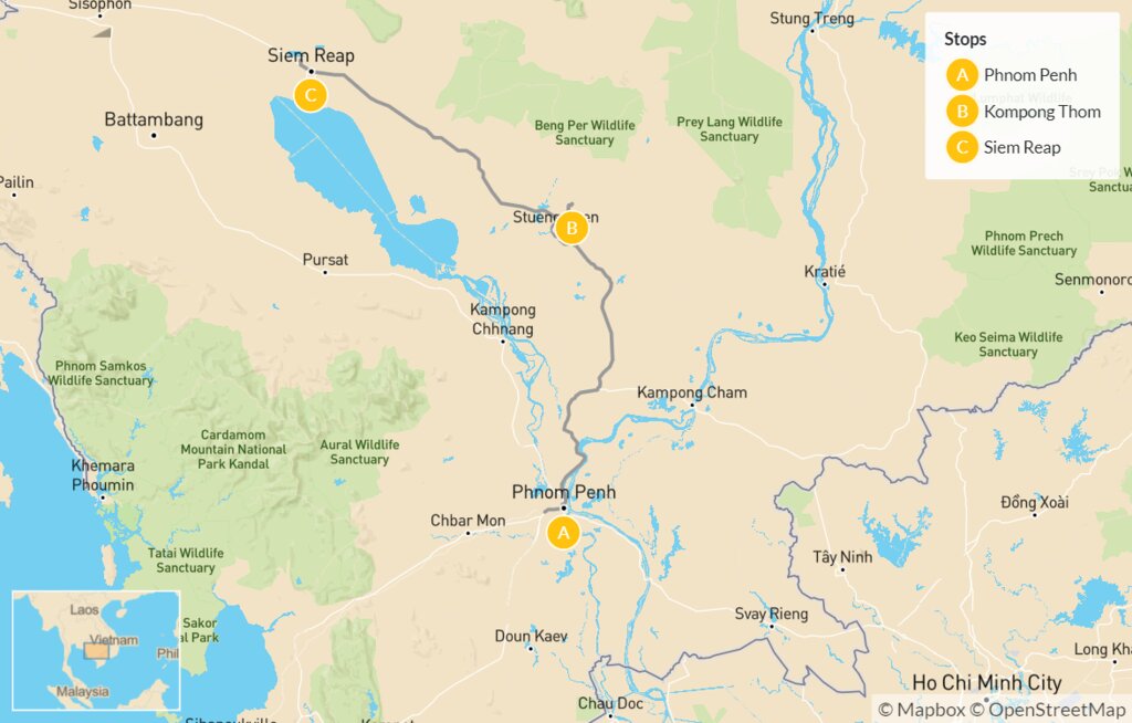 Map of Tour Cambodia’s Ancient Temples: Phnom Penh, Kompong Thom & Siem Reap – 8 Days