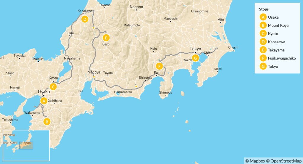 This immersive 14-day cultural adventure starts in Osaka, where you’ll sample renowned cuisine and stroll through ancient shrines. Take a day trip to Kobe for its coveted beef, then it’s off to Mount Koya for quiet hikes and an overnight in a Buddhist temple. Eat your way through bustling Nishiki Market in Kyoto, learn Japanese arts and crafts in Kanazawa, see sweeping views of Mount Fuji, and end with the bright lights of Tokyo, touring the gardens of the Imperial Palace and Senso-ji temple.