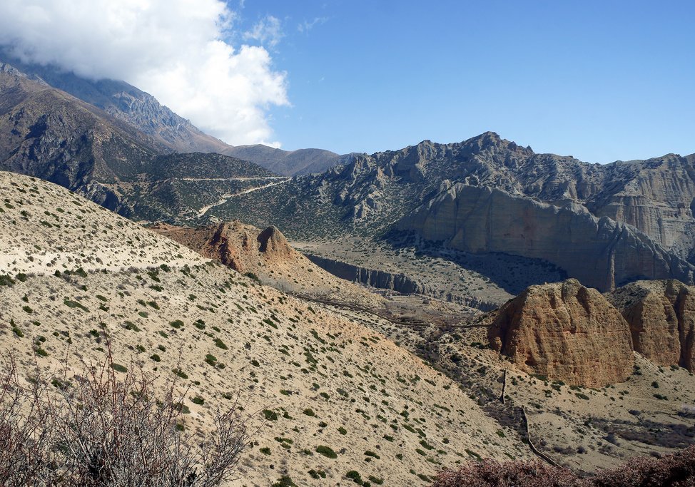 Get your Upper Mustang permit checked just outside Kagbeni, and begin the trek into the region, following a trail alongside the Kali Gandaki River. The path here is quite sandy, and you turn uphill. Reach the village of Tangbe, where you can admire the narrow alleyways, white-washed houses, barley and buckwheat fields, and apple orchards.