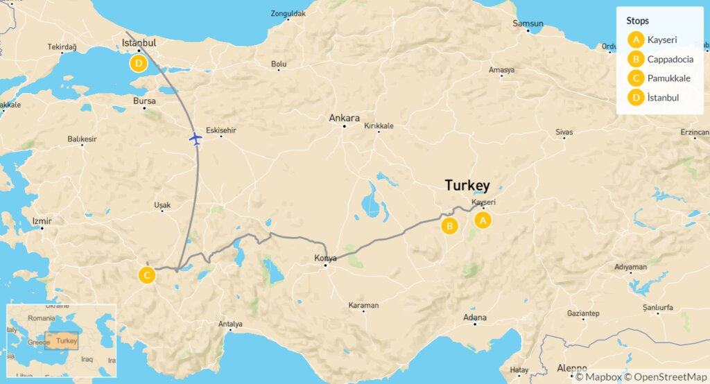 Map of Turkey’s Top Landmarks Tour: Cappadocia, Pamukkale & İstanbul – 8 Days