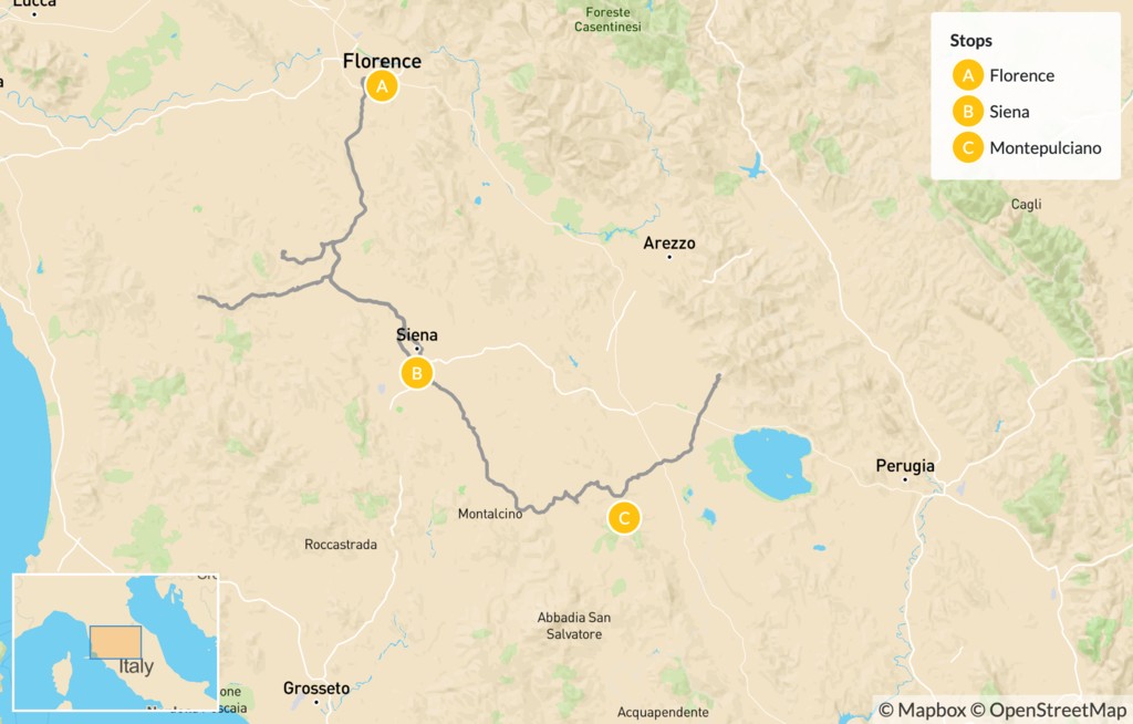 Map of Tuscany Road Trip: Florence, Siena, & Montepulciano – 9 Days