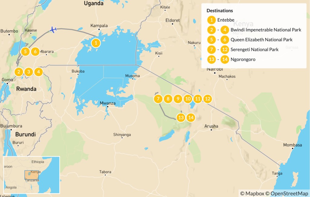 Map of Uganda & Tanzania Safari: Bwindi, Queen Elizabeth, Serengeti & Ngorongoro – 15 Days