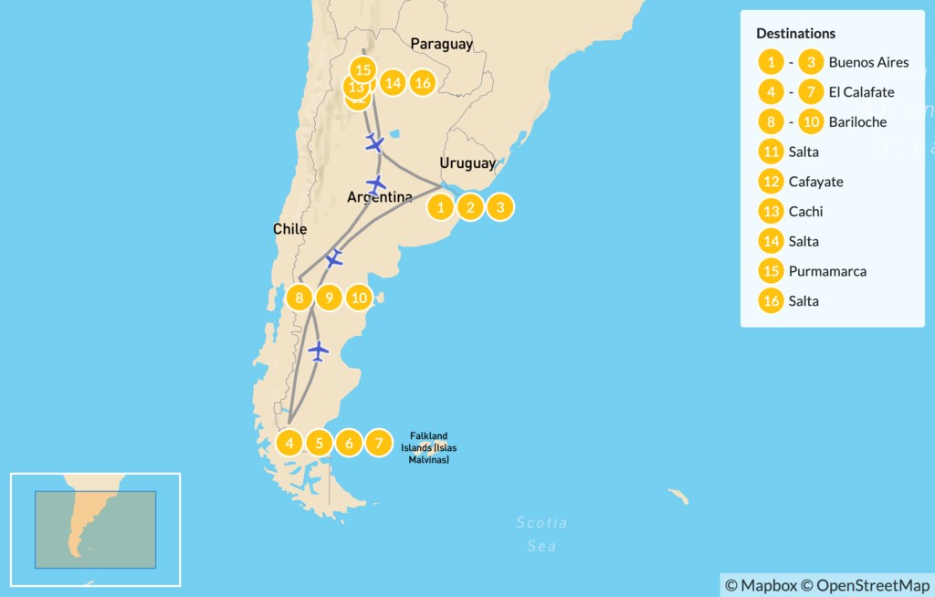 Map of Ultimate Argentina Road Trip: Buenos Aires, Patagonia, Lake District, & More – 17 Days