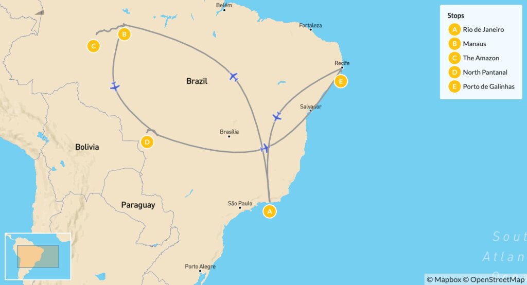 Map of Ultimate Brazil Adventure: Rio de Janeiro, the Amazon, North Pantanal & the Coral Coast – 14 Days