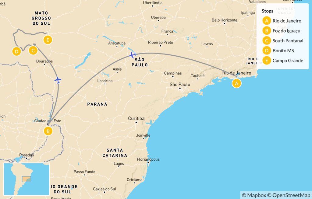 Map of Ultimate Brazil for Active Families: Rio de Janeiro, Foz do Iguaçu, South Pantanal & Bonito – 14 Days