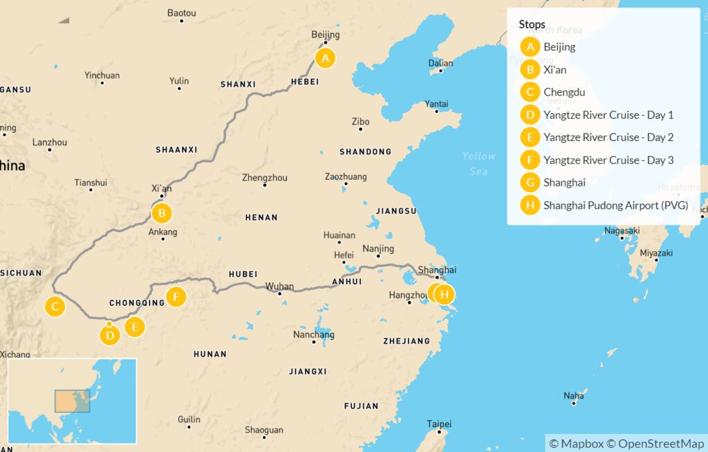 Map of Ultimate China & Yangtze River Cruise: Beijing, Xi’an, Chengdu & Shanghai – 13 Days