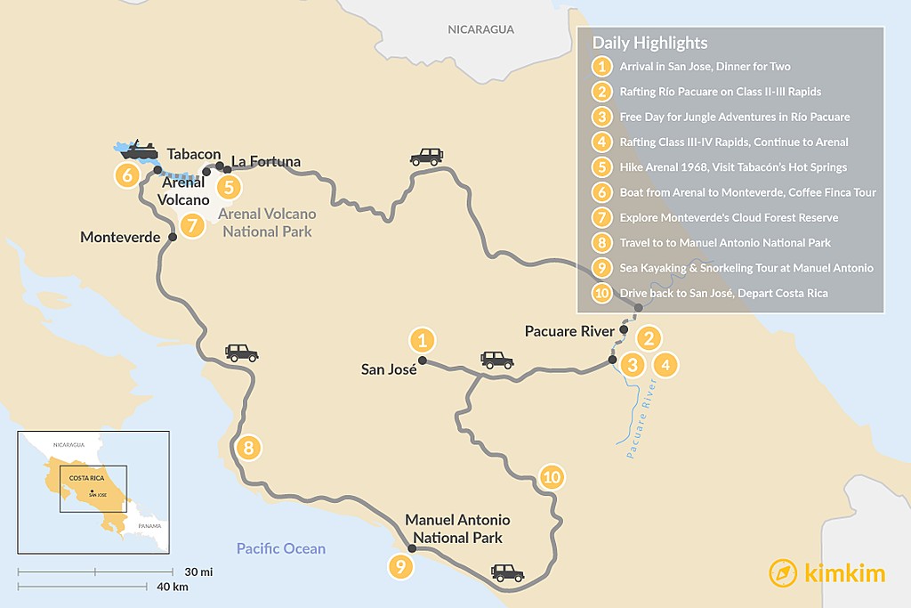 Map of Ultimate Costa Rica Honeymoon – 10 Days